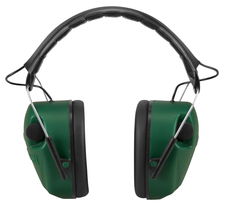 Caldwell's standard E-Max hearing protection combines great circuitry with a low profile earcup ideal for shotgun shooters and action shooters. The microphones in the E-Max amplify sounds below 85 decibels, which includes normal communication, range commands, and environmental sounds. Above 85 decibels, the microphones shut off for a split second to protect the shooter's hearing. Two microphones, one in each cup, give the user true stereo sound and allow the user to identify the directional source of a sound. E-Max hearing protection has a padded headband, audio input jack, volume control knob, and power indicator light. E-Max earmuffs provide a 23NRR and run on 2 AAA batteries (not included). This model has a green finish on the earcups.