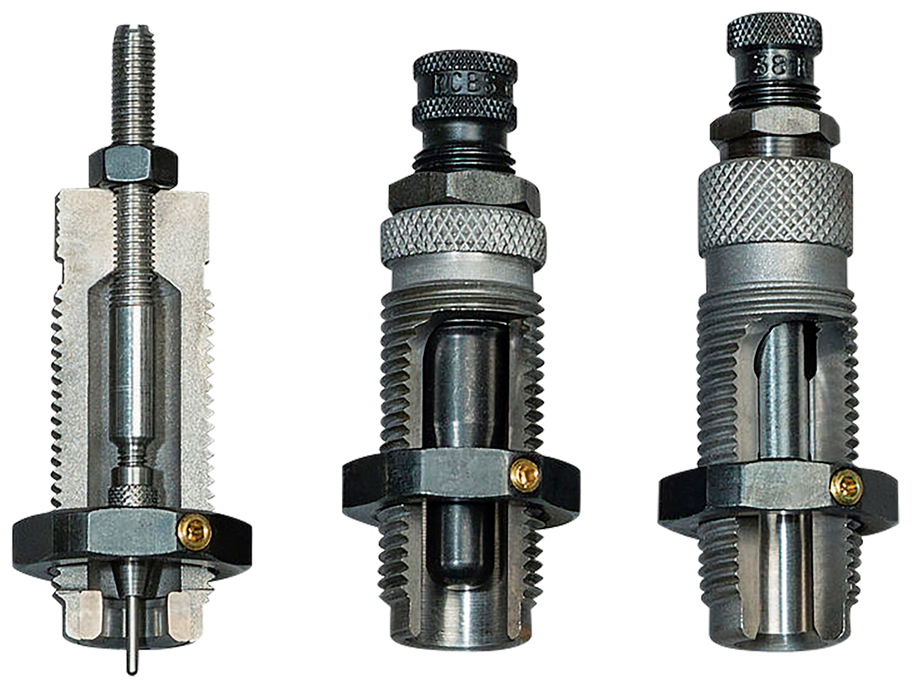 The 3-Die Roll Crimp Set is for loading straight-wall cartridges. Its steel Sizer Die sizes the case and de-primes. Note: Cases must be lubricated. The Expander Die expands the case to the proper diameter to accept the bullet, and it imparts case mouth flare/bell for bullet feeding. The Seater Die seats the bullet and roll crimps.