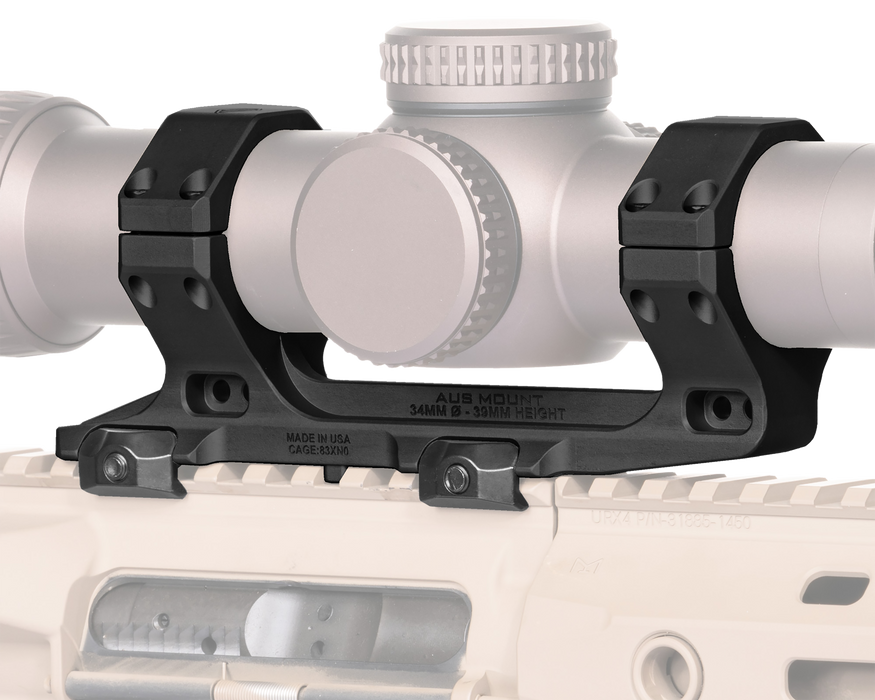 The AUS Mount for 34mm diameter magnified optics, from Reptilia. Like the DOT Mount line the AUS Mount attaches to any M1913 Picatinny rail via the anti-snag spring-loaded nitride steel clamp and custom bolt mounting system which can be tightened with either a 5/32 hex or a flat blade driver to sit flush with the body of the mount for a low-profile, streamline design. Also like the DOT Mount line, the AUS mount is machined from a single piece of billet 7075-T6 aluminum and is finished with MIL-STD Type III, Class 2, hard anodize coating.