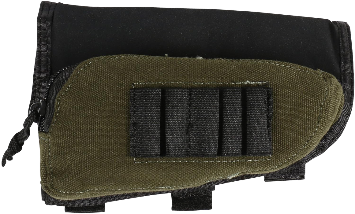 The Adjustable Buttstock Shell Holder attaches to the buttstock of any rifle with an adjustable hook and loop strap system. Individual shell loops hold 5 cartridges, and a zippered pocket holds other accessories, like clips, hearing protection, or hunting aids. Soft plush fabric covers the cheek piece for comfort during shooting.